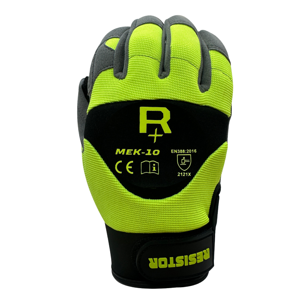 Guante de alta visibilidad con aplicaciones antivibración de Porón en palma. Repele los líquidos por lo que es adecuado para ser usado en trabajos expuestos a líquidos o humedad.